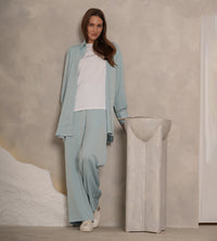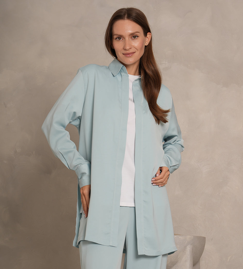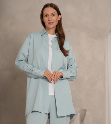 Blue Crepe set, long sleeve shirt and a long wide trouser.