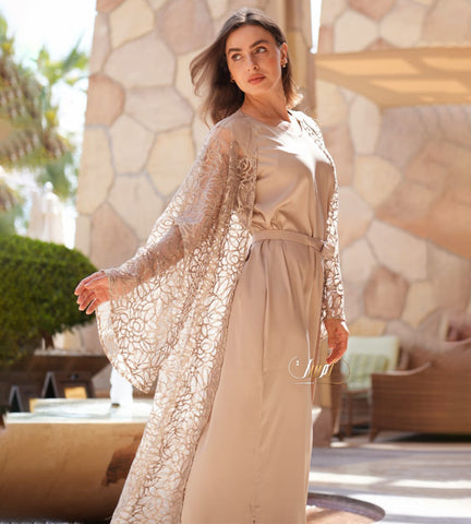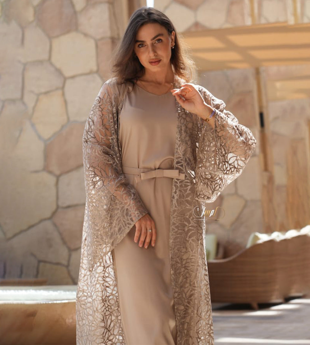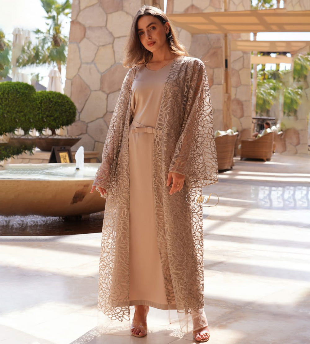 Golden abaya with unique beadwork, paired with a crepe dress and belt ?? \nOne size