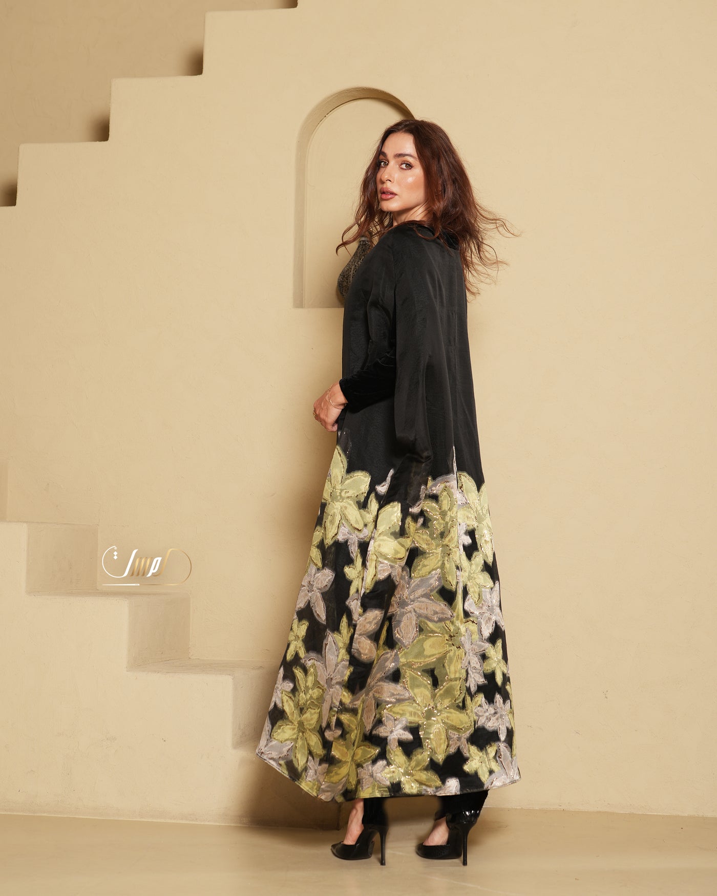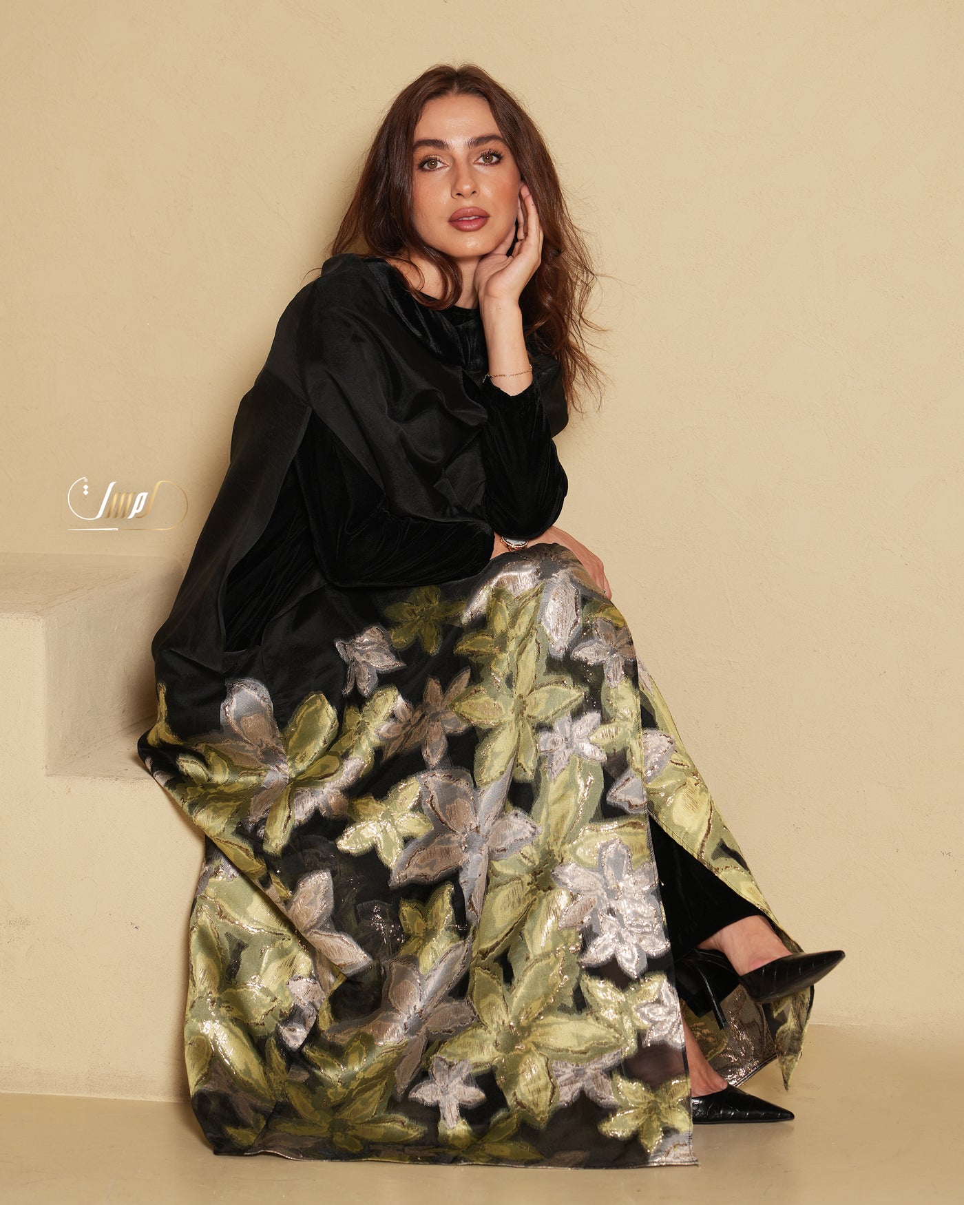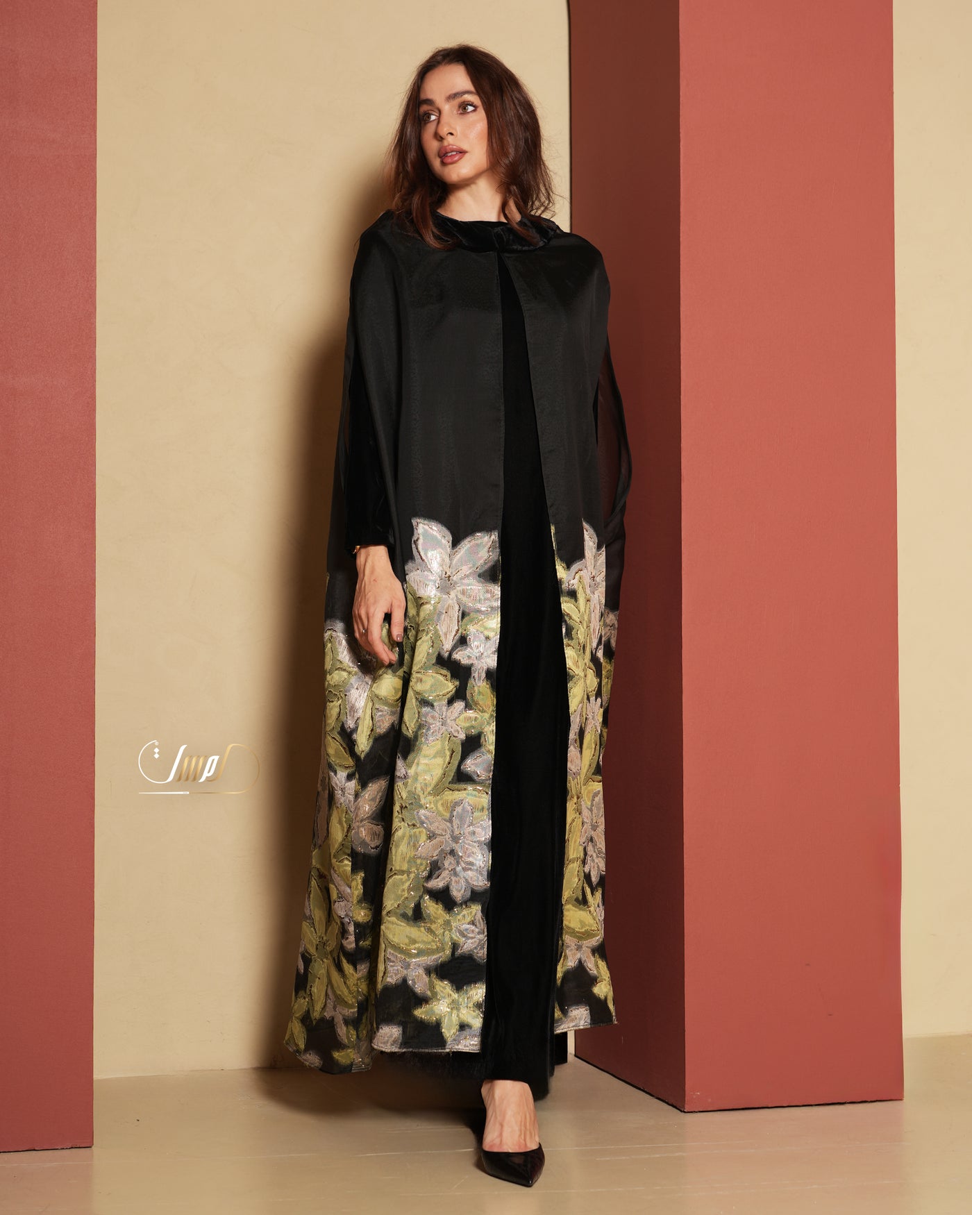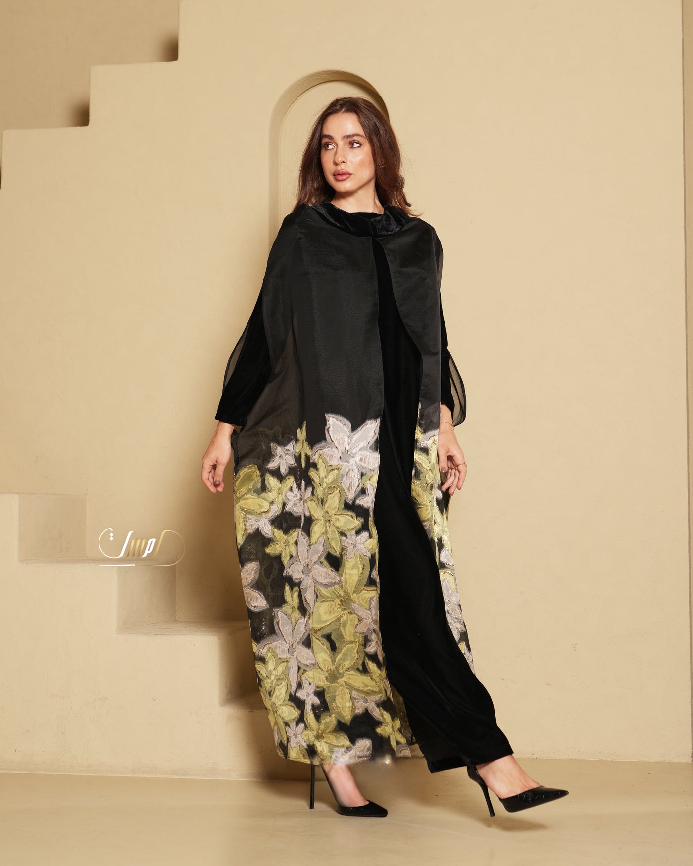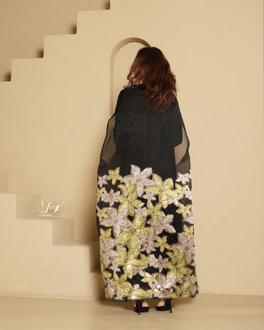 A luxurious organza abaya adorned with delicate rose embroidery, featuring a refined velvet collar and paired with an elegantlong-sleeved velvet dress for a timeless, sophisticated look.🌼One sizeÂ