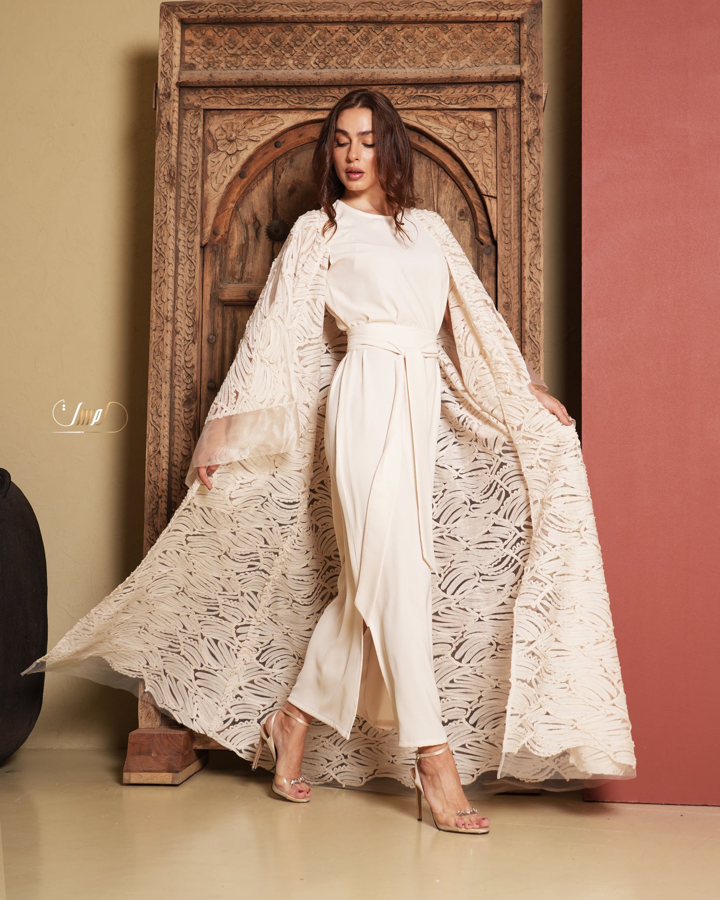 A luxurious beige abaya with a wide, flowing silhouette, adorned with raised patterns that add an elegant touch. Paired with a soft, matching dress and a chic belt that defines the waist, completing the look with subtle sophistication ✨One size