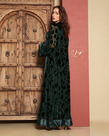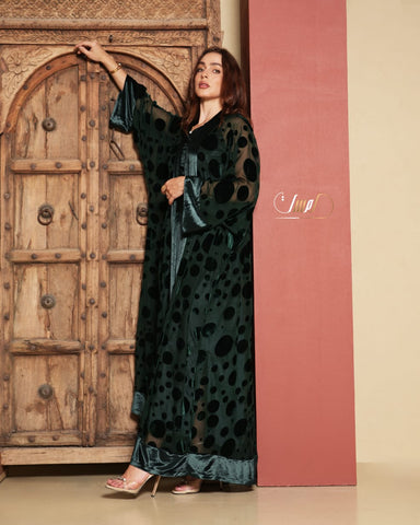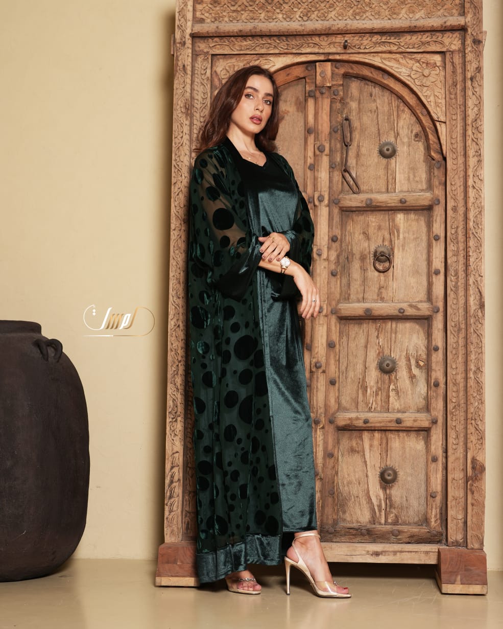 green velvet abaya adorned with raised circular patterns, paired with a velvet dress and an elegant belt that enhance its striking sense of luxury. Designed with a wide, flowing silhouette and soft sleeves, it offers a refined and distinctive look